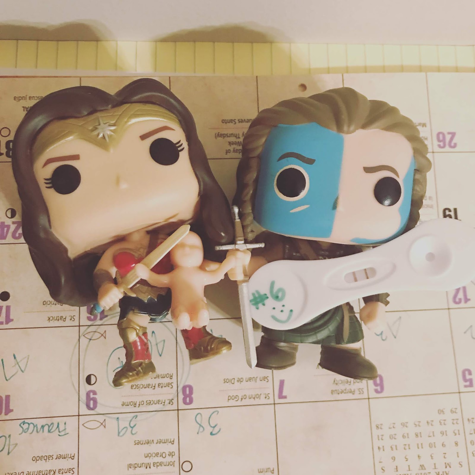 | Wonder Woman and Bravehart; I'm holding baby #6 and he's holding the pregnancy test! |