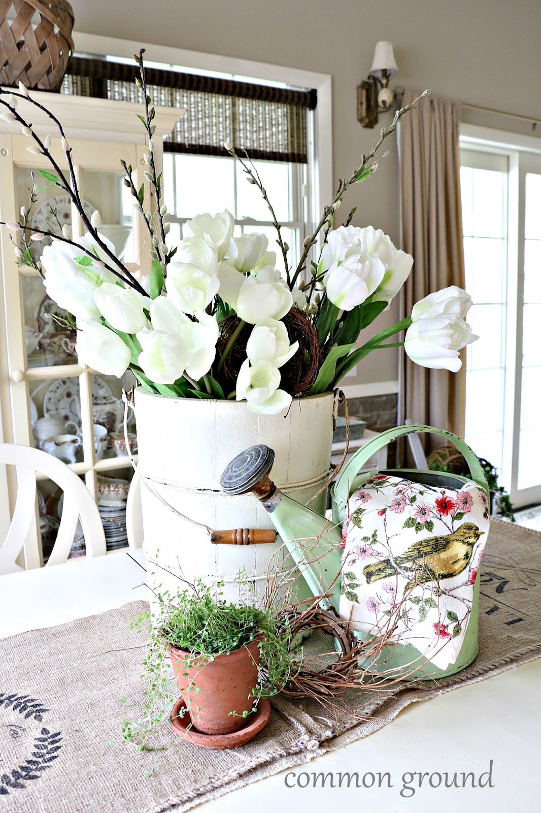 Last week I had fun putting a new farmtable vignette together with a few vintage pieces. I use my old ice cream bucket frequently as it holds big bunches of flowers and branches. Even though these tulips are faux they still brighten up the space. Farmtable Bucket with Tulips