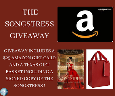 To celebrate her tour, Lori is giving away the grand prize package of a Texas Gift basket including a signed copy of THE SONGSTRESS and a $25 Amazon Gift Card!!