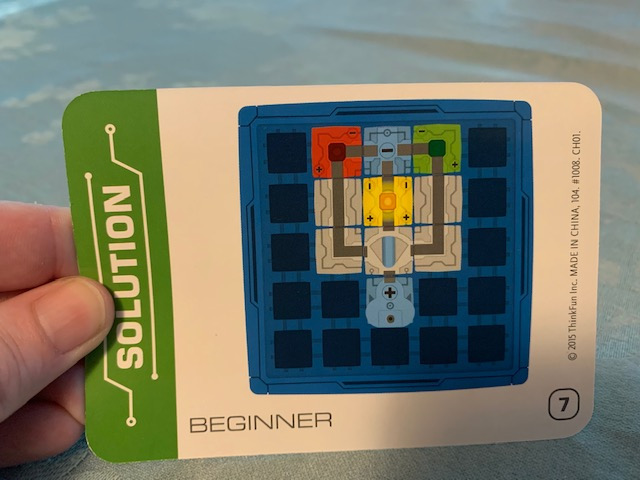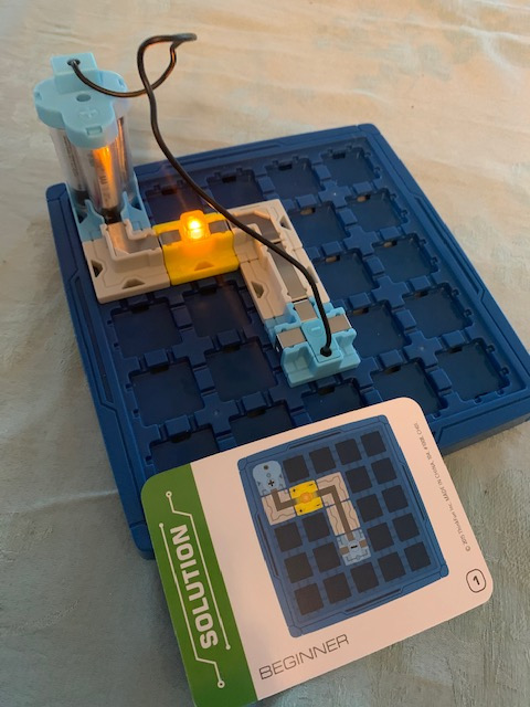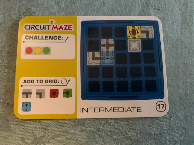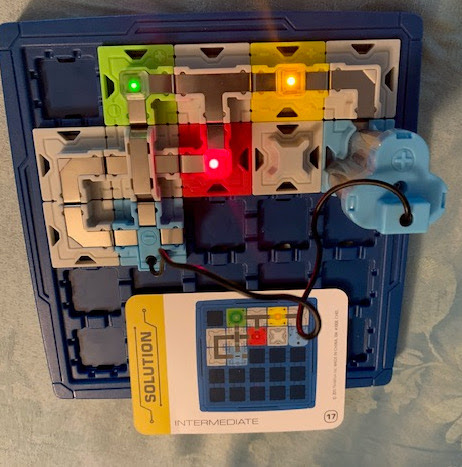 What's included? There is a 5x5 game grid, 17 game tokens (1 two-part power source (start and finish token), 3 LED beacons, 2 straights, 1 bridge, 1 double corner, 2 t-shapes, 5 corners, 1 switch and 1 blocker), instructions and 60 challenge cards that range from beginner to expert with solutions. I do want to mention that this requires 3 AAA batteries and they are not included.