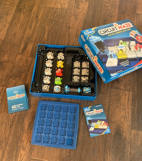 I have a fun logic game to share with you today from Timberdoodle, Circuit Maze! Circuit Maze is a single-player game manufactured by ThinkFun and is geared for kids 8 and older or third grade and up (even adults can enjoy it). It teaches concepts of electricity in a unique way using a series of circuit-building logic puzzles.