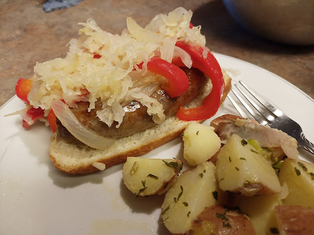 In honor of the Olympic games, we have been eating "International Foods" for the last week, so our homemade sauerkraut turned out to be an absolutely perfect accompaniment to our German themed meal of brats with peppers and German potato salad. The sauerkraut had the perfect salty/sour taste was enjoyed by everyone. I'll definitely make another batch when this batch is gone, but I think I'll add Caraway seeds next time around.