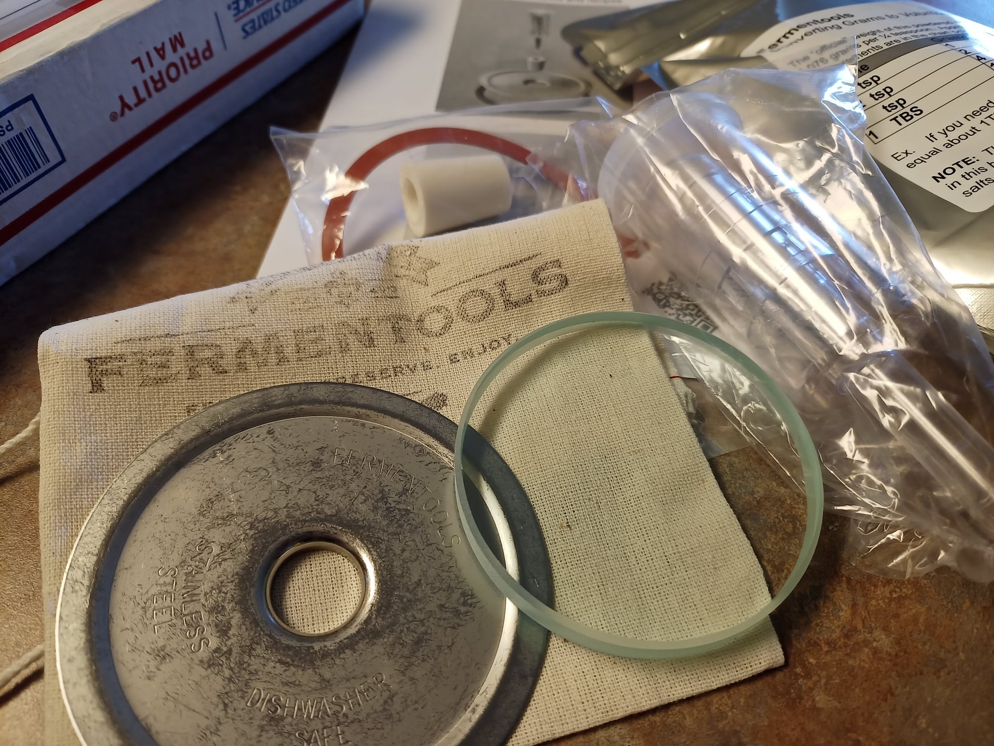 This included 1 304 stainless steel lid that is corrosion resistant and extremely sterdy, a glass fermentation weight made to fit inside a standard widemouth Mason style jar, 1 plastic air lock that is easy to disassemble for cleaning, a pair of rubber stoppers (1 with a hole for the airlock, one solid), a rubber caning gasket to place between the lid and the mason jar to guarantee a good seal, a bag of Himalayan powdered salt, and an instruction pamphlet with instructions and a recipe for making sauerkraut to get you started.