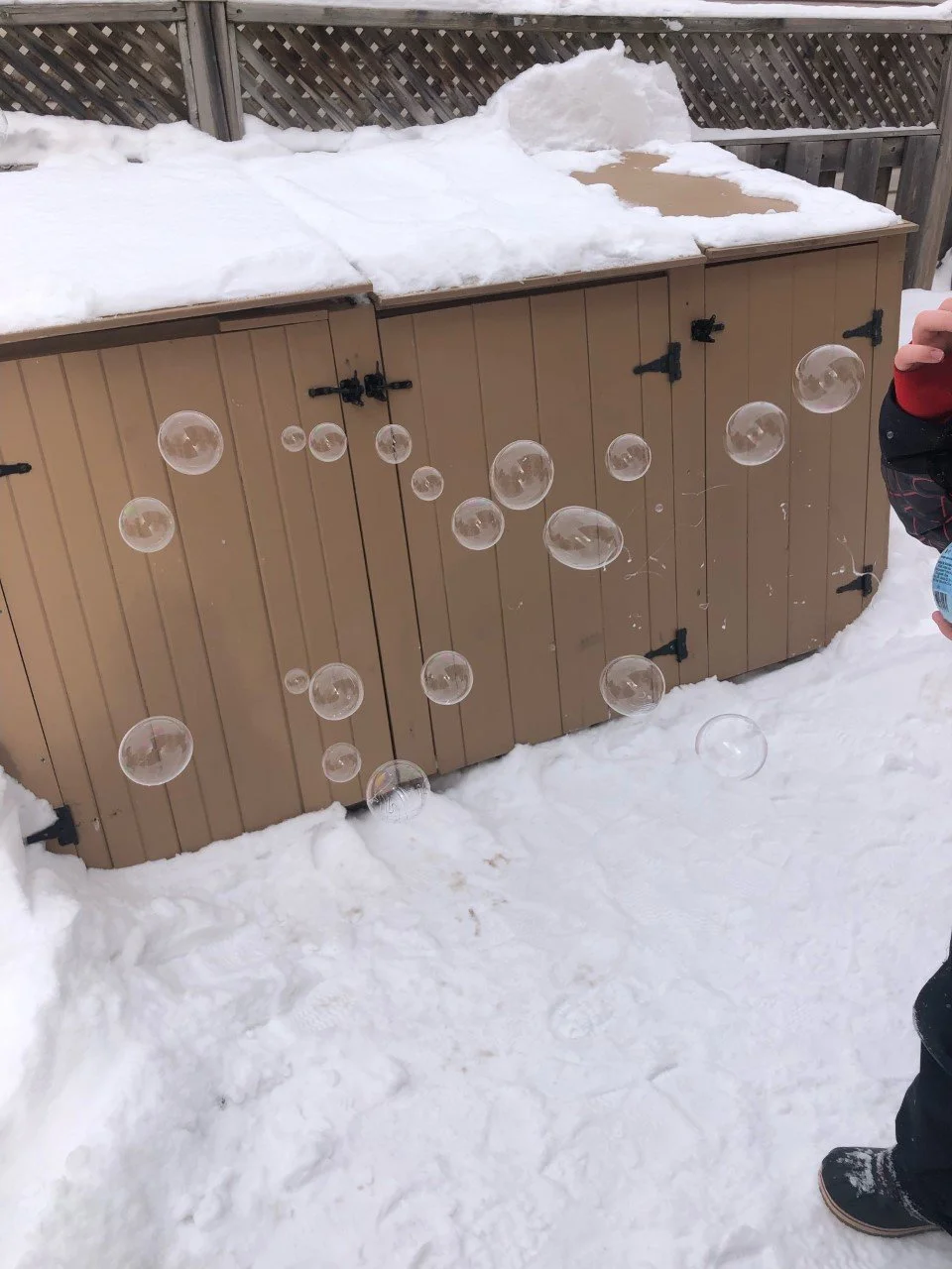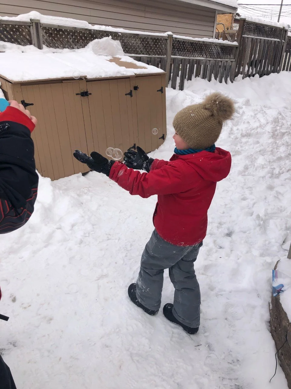 If you blow them directly onto the snow, they’ll stick and slowly crystalize; if you blow them in the air they’ll start to freeze over in the air (my kids had fun seeing who could catch or pop the most before they fully froze). The bottle says they are most effective below -7 C (plenty of those days ahead in the forecast), and it’s helpful to play with these on a day without much wind or in a sheltered area. A word of caution though- the bottles get very messy, very quickly! (or maybe it’s just my kids… but I had to grab a towel for wiping hands and bubble bottles before I let anyone back in the house!) My kids played with these for over an hour, and even I had fun being out in the cold trying them out!