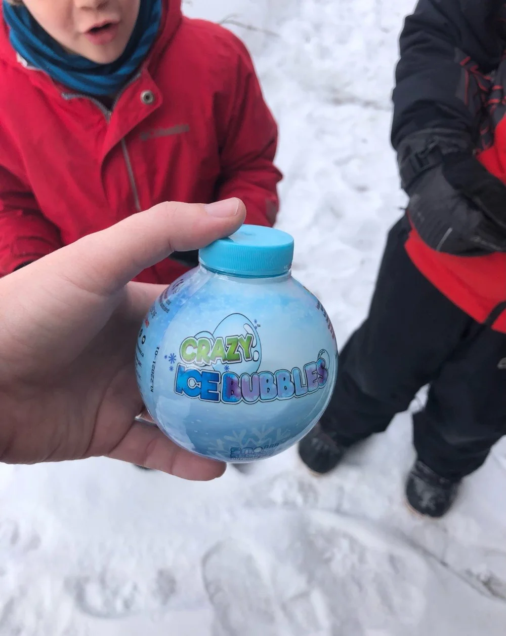 So while I dream of warmer weather to come, I’ll keep looking for ways to enjoy winter so that my kids’ memories of winter don’t include my grumpy, frozen face. This week, I found out about Crazy Ice Bubbles, which made for an awesome distraction during the coldest day of the year! The bubble solution makes “extra strong” bubbles that rest gently on the snow and slowly freeze over. We have tried to make our own winter bubbles before using regular bubble solution or dish soap, and these yielded much better results!