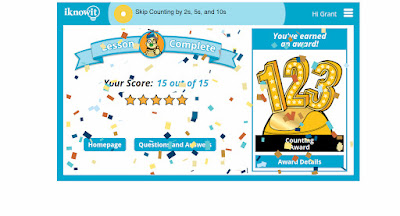 G earned an award for completing his lesson on Skip Counting and getting 15 out of 15 questions correct.