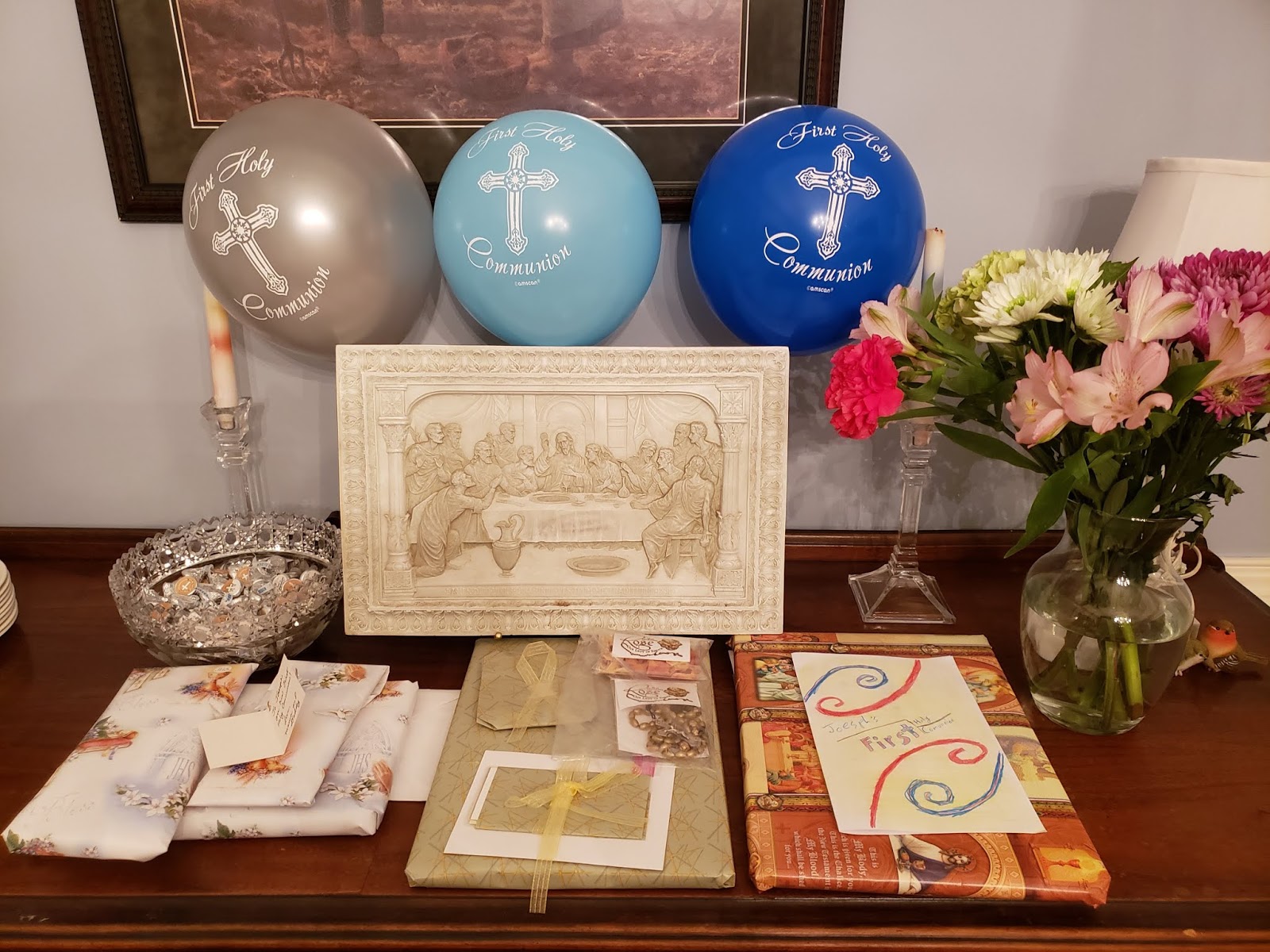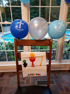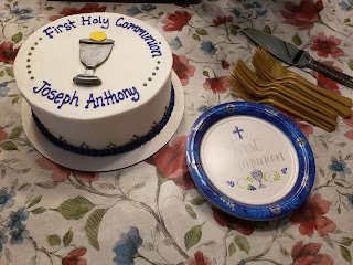 Because our Mass is at 12:30 and we often are not home until 3:00 or 4:00, we tend to have celebratory dinners for Sunday events on Saturday. Our fancier-than-normal meal to celebrate the vigil of Joseph's First Holy Communion was: