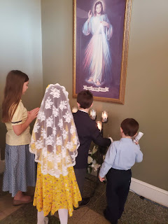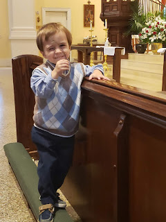 It was "interesting" to say the least trying to manage Mass for the first time in almost three months with these little tykes, whom I would normally never have sit in the first row under any circumstances. We took David out four separate times (and missing seeing Joseph's reception as a result). Below, he is showing you his "flower," which is a piece of too-tall grass he plucked and treasured in response to jealousy at seeing his brother Joseph carrying a beautiful cut flower to put in a vase at the foot of the statue of Our Lady. David wanted a flower, too!