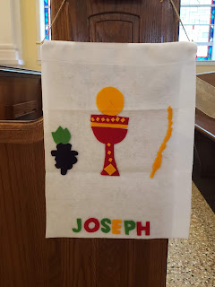 Due to the social distancing required by the parish, we had our own pew reserved and Joseph was instructed to hang his banner there. At our parish, this week during Phase 2, only 140 people are allowed in the church itself. The staff had put four tents outside, some chairs, and a big bucket of ice waters for the few dozen sitting outside in the humid heat. Indoors, every other pew was roped off with a pretty ribbon, and family units were instructed to sit six feet apart from anyone else in the pews.