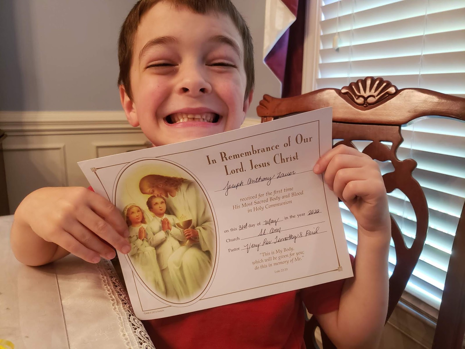 Joseph was able to open one gift before Mass: we bought him a new brown scapular, hand sewn by Tracy Cruz to commemorate both First Holy Communion and the twin hearts, as well as the red for the Feast of the Pentacost on which Joseph would be receiving. Before the Mass, the communicants were enrolled in the brown scapular.