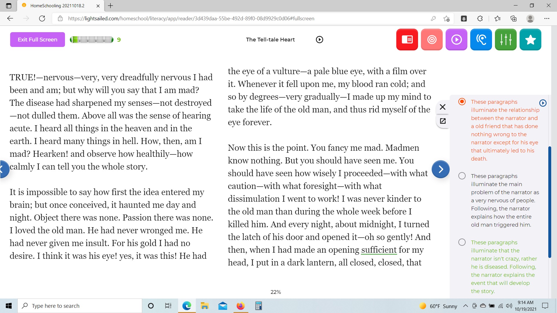 These texts are embedded with assessments and cover a variety of subject matter. Once a book is selected, it is uploaded to the students account so they can begin reading it. As the student reads the book, different questions are presented. These questions can be comprehensive, asking about something going on in the story, or they can ask about what the author is trying to get across to the reader. Other activities might ask the student to fill in a missing word that has been omitted from the sentence. If the student answers the question wrong, the answer they selected turns red and the correct answer is colored green for them to review. These activities are designed to improve comprehension, recognize main points of the story, and help build and improve vocabulary while the student reads. As student ability grows, LightSail tracks achievement and updates the selections in each reader’s library – that way, students are always reading just right texts.