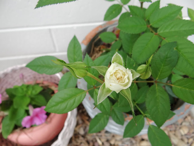 When I came home it was time to tend the garden. It still amazes me how the roses come to life here in the winter, and I especially love the miniature white rose near our back door. This year I've been drawn to white and planted out white marigolds as well. All the white flowers create a striking background to the deep pink petunias and red geraniums...