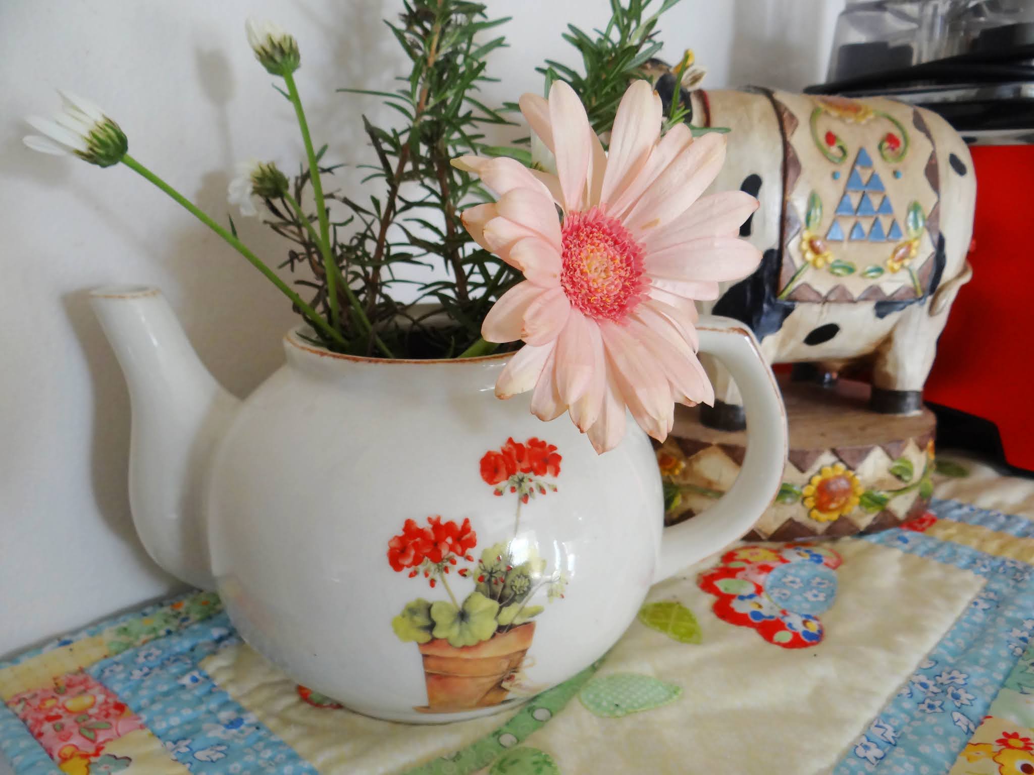I've also popped some rosemary in my favourite (unusable) tea pot with a few baby chrysanthemums and a gerbera (which was attached to the wrapping of my gift from Blossom) and the fragrance through our kitchen is wonderful!