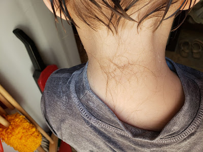 | Hairs falling out and sticking to his neck |