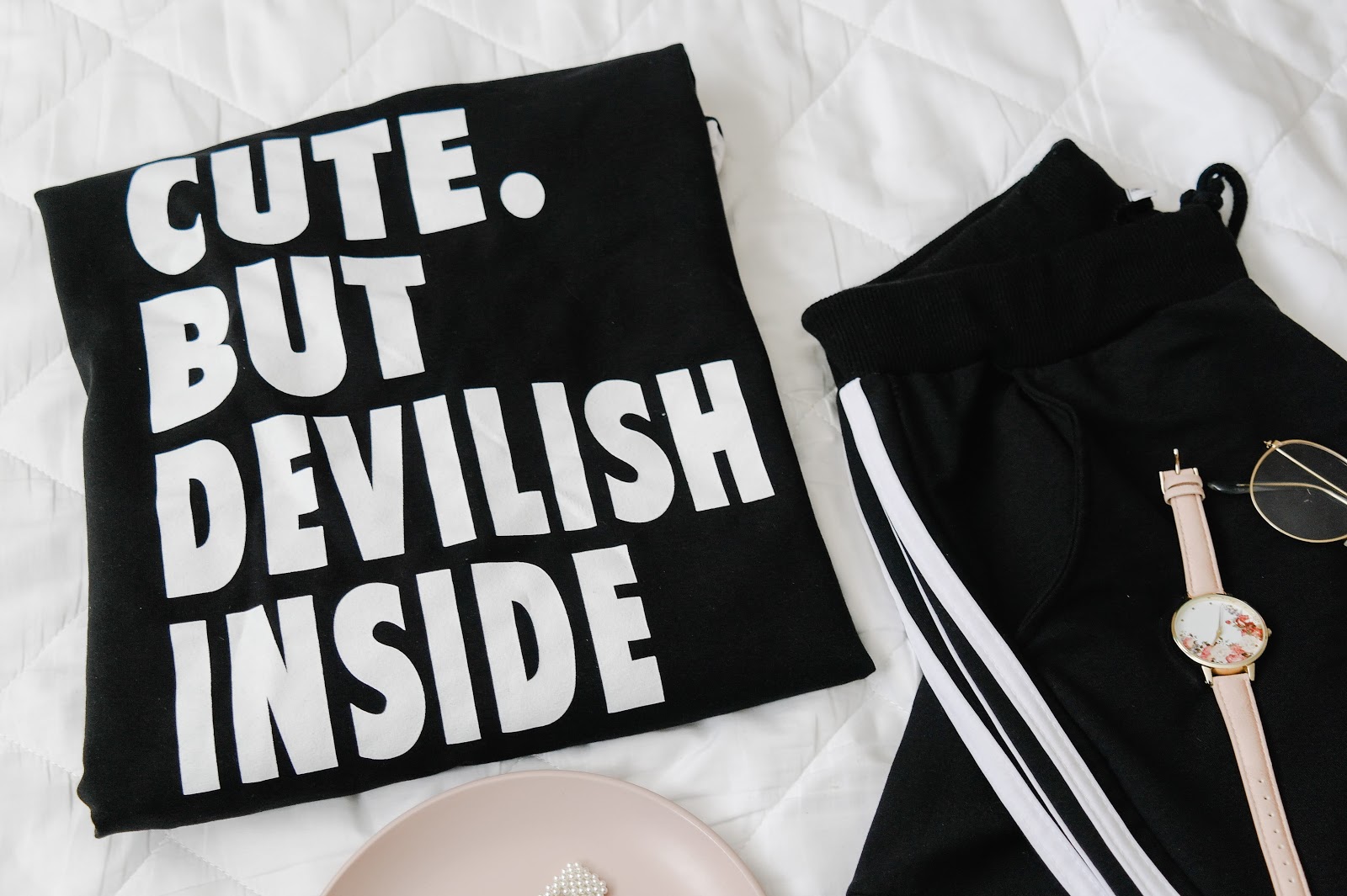 Ultra stretch chic lounge set? Yes, please. That's exactly what we need for those lazy days going from your bed, to the couch, to the kitchen. Featuring a contrast stripe design with a 'Cute But Devilish Inside' slogan top with slim fitting bottoms really adds some fun to the cute ensemble.
