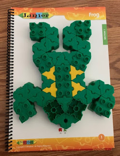 The finished frog side-by-side with the build page. It shows them which pieces they will need and the quantity as well. As the builds get more complicated, the pages have more steps and photographs.