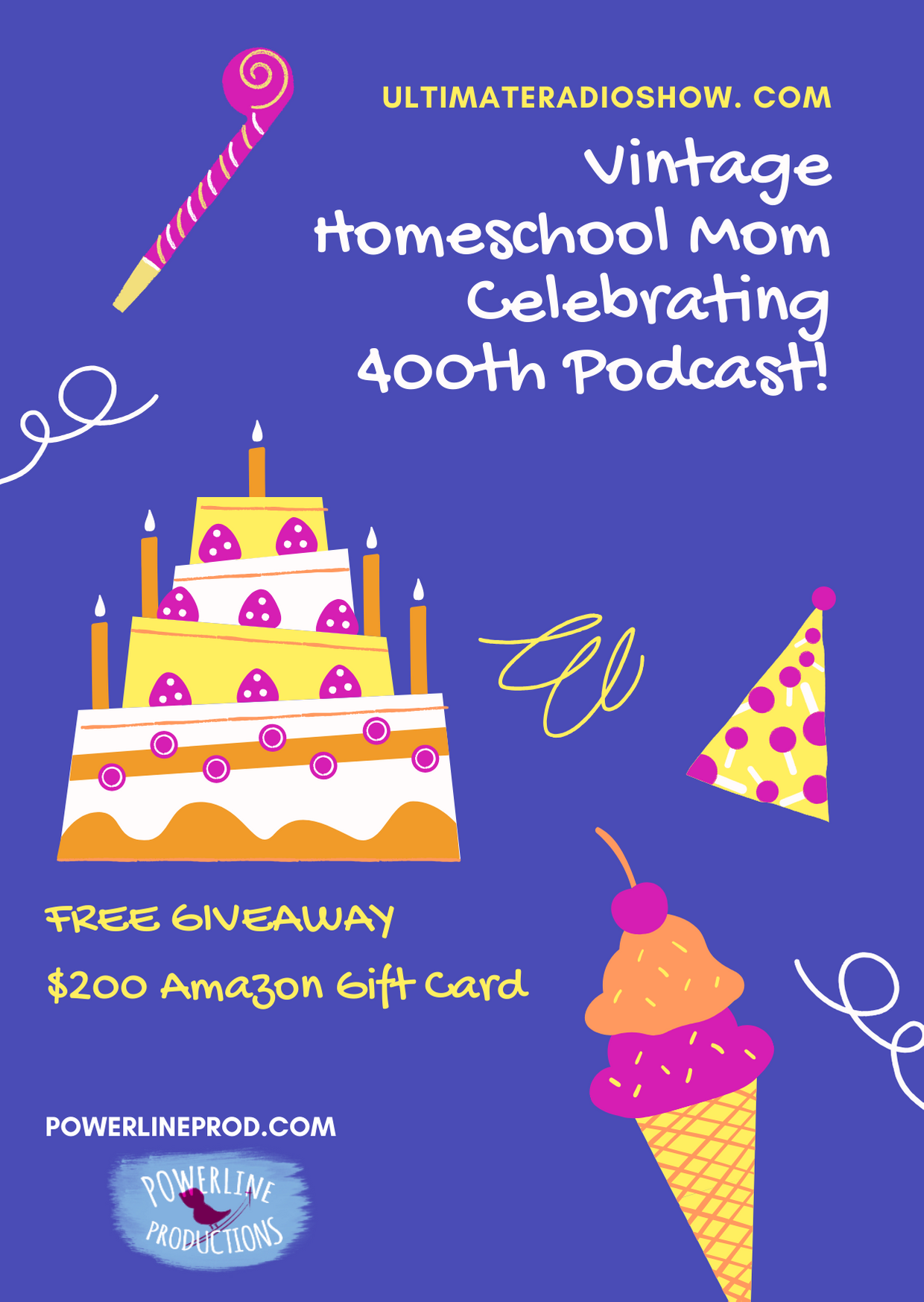 Today I am super excited to be helping my friend Felice Gerwitz from Vintage Homeschool Moms celebrate her 400th Podcast Episode on Vintage Homeschool Moms!! Together several of us have come together to help her celebrate by giving away ONE $200 Amazon Gift Card.